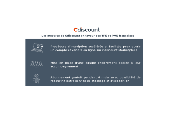 - Description de l’offre : L’offre consiste en une procédure accélérée et simplifiée d’inscription sur la marketplace de Cdiscount, incluant la gratuité de l’abonnement pendant 6 mois et un accompagnement des commerçants par une équipe dédiée pour la mise en ligne de leurs offres, ainsi qu’une possibilité de recourir au service proposé par Cdiscount de stockage et d’expédition des commandes (fulfillment). Dans le cadre de cette offre et pour renforcer la visibilité des commerçants, Cdiscount proposera très prochainement à ses clients un parcours dédié pour identifier leurs commerçants locaux.