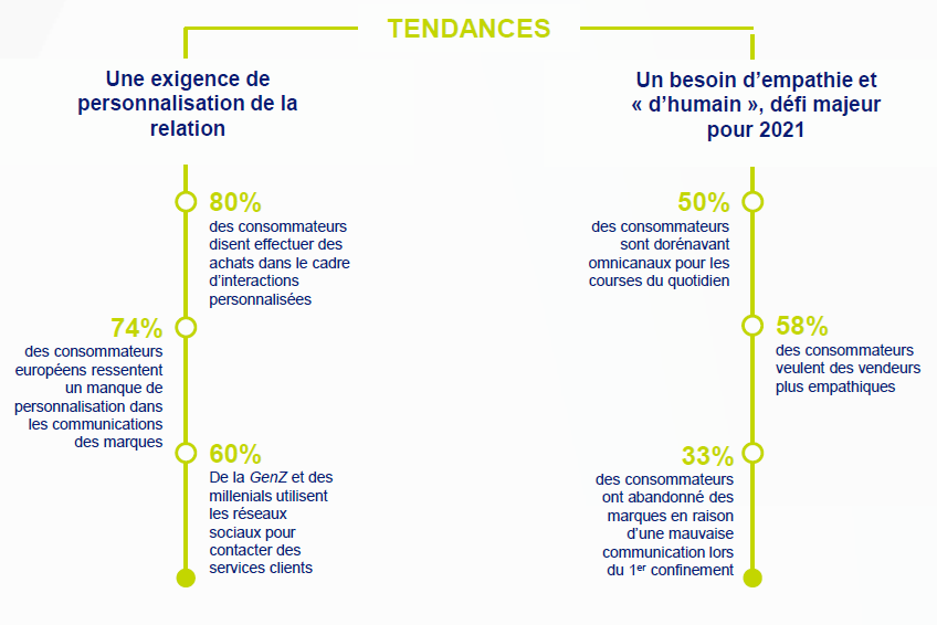 Du côté des compétences attendues des salariés en relation clients, les compétences émotionnelles, relationnelles et humaines (soft skills) devront ainsi être une priorité d’autant plus que la crise sanitaire semble avoir exacerbé les attentes des consommateurs en matière de bienveillance et de « care ».